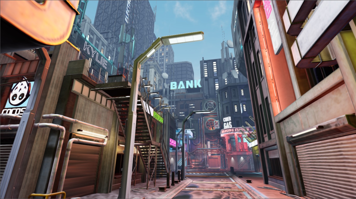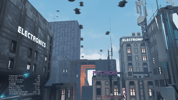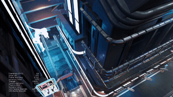 无独有偶,在 Cocos 的赛博朋克 Demo 中,异彩纷呈的霓虹灯同样贯穿了建筑群的每一处、占据受众的全部视野,很好地演绎了大众印象中的赛博朋克美学。