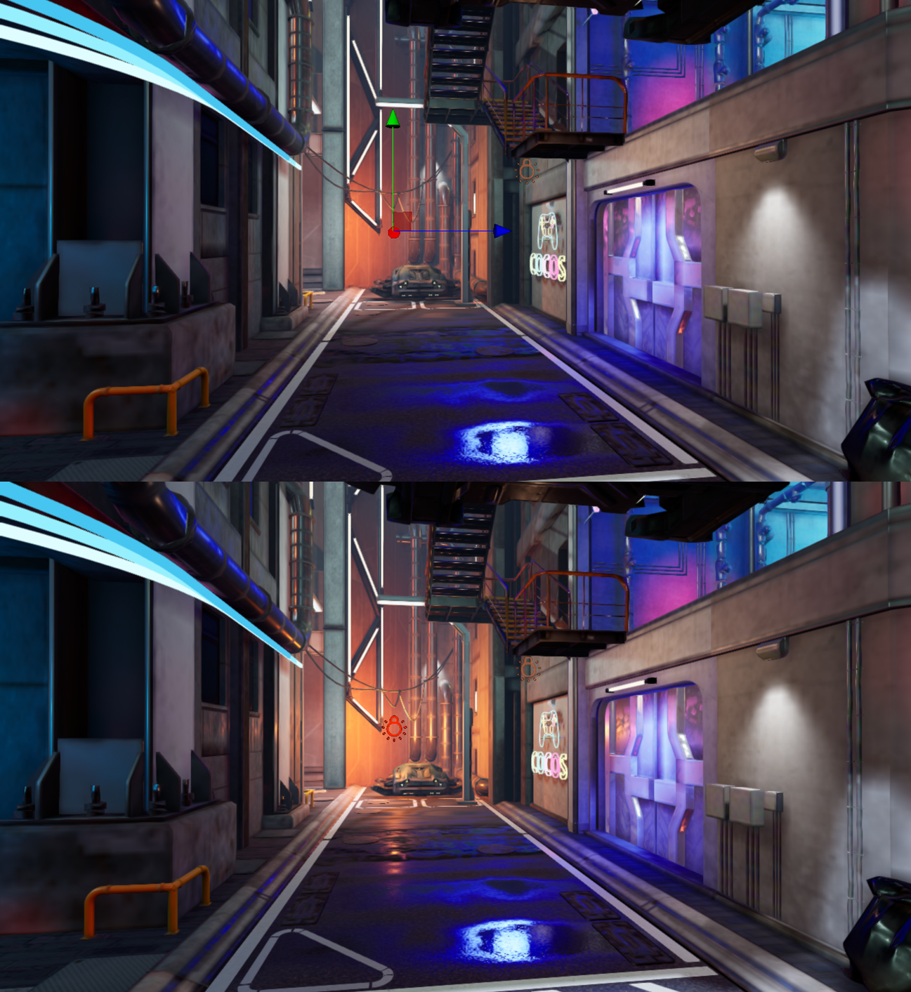 与传统做法中,出于移动端性能的考虑,只用一张天空盒作为环境贴图、或者一整个世界烘焙出一张环境贴图的做法相比;为了避免穿帮、追求更高的真实感 ,Demo 里尽可能在不同的区域中放置反射球,让每个反射球只烘焙这一个区域中的环境信息。