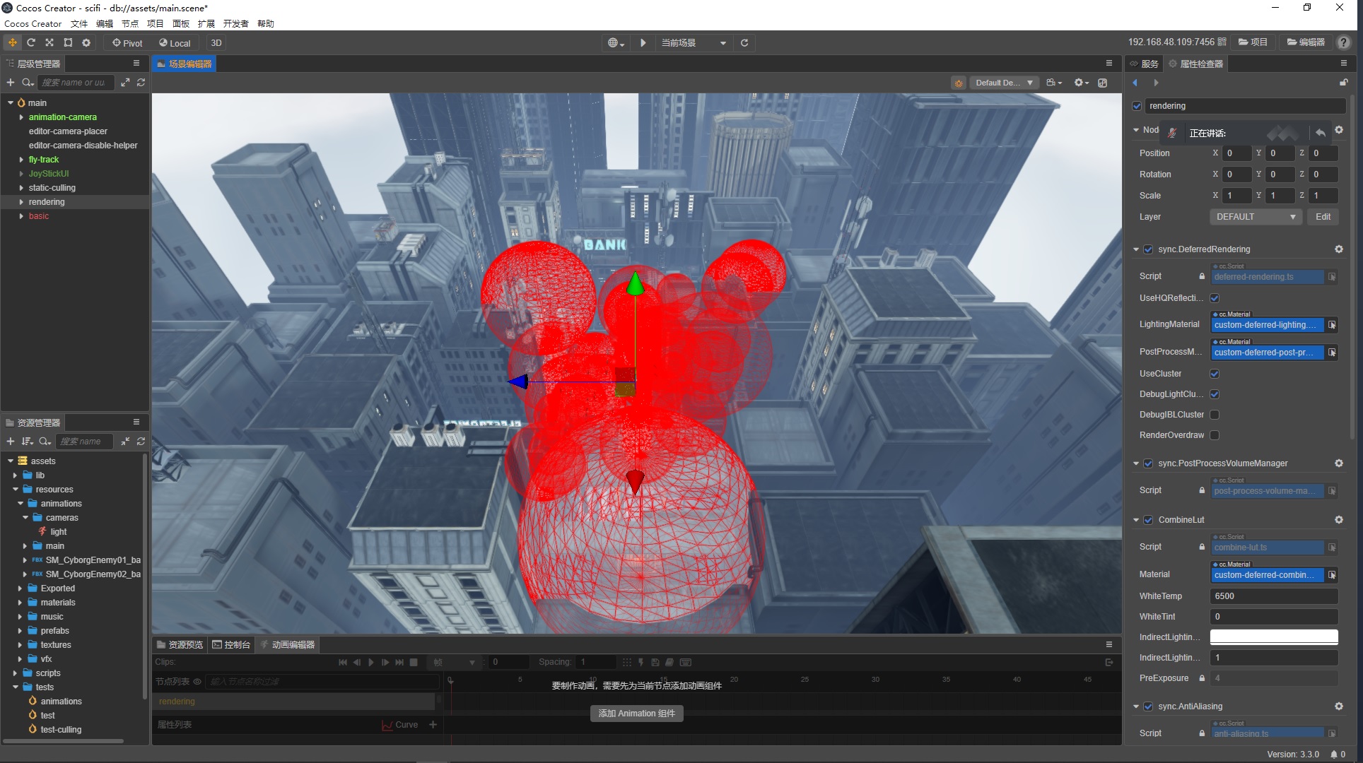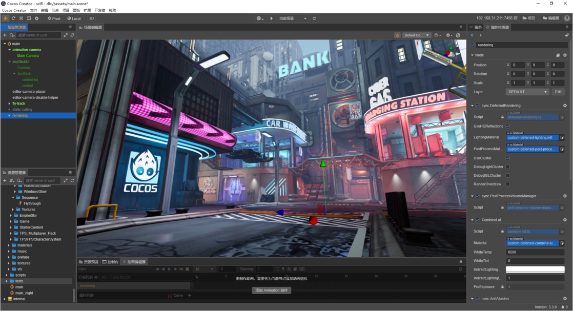 “我们选择赛博朋克作为这次 Demo 的主题,也是因为它的光污染风格,适合放进去大量的光源,体现引擎的渲染能力”,聊到此处, Cocos 高级引擎开发工程师、本次 Demo 的制作者 youyou 也向 GameLook 介绍,这种独特光照效果的实现,其实是来自 Cocos Creator 3.3 版本中延迟渲染管线 、Cluster Light Culling、Cluster Reflection Probe 等多个特性。