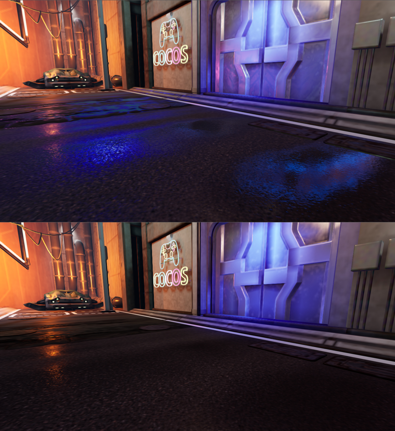 如果更细心的话还会发现 ,Demo 中镜头俯拍城市时,道路积水也会倒映出对应各色霓虹灯的反光效果。而这种饱含真实感的细节,则是通过 IBL (Image Based Lighting ) 实现的。