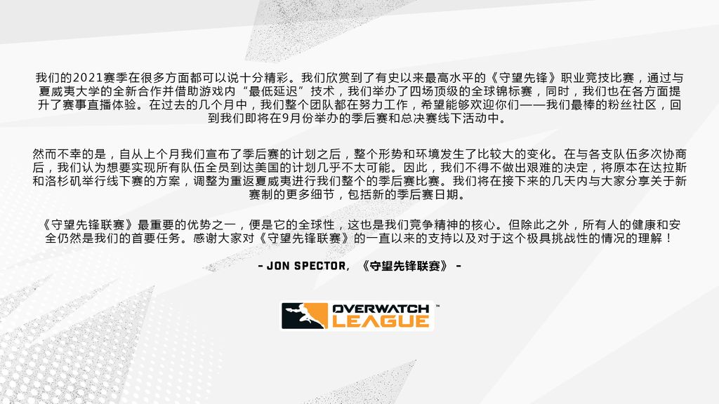 2021 年《守望先锋联赛》季后赛遇到了一个小插曲。昨天联盟宣布将不再在达拉斯和洛杉矶举办现场比赛。联盟在推文中写道:“由于环境发生了重大变化,影响了一些球队的旅行,我们决定不再安排原定在达拉斯和洛杉矶举行的现场赛事。季后赛将回到夏威夷进行季后赛”。