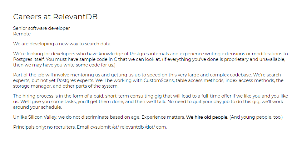 RelevantDB的创始人是克里斯·克利夫兰(Chris Cleveland),他今年快60岁了,也是一名性别歧视的受害者。他在《黑客新闻》上写道:“去年,我曾试图面试开发人员的工作。尽管有40年的经验,还是一无所获。我真的,真的厌倦了这个行业对待我这样的人的态度。”