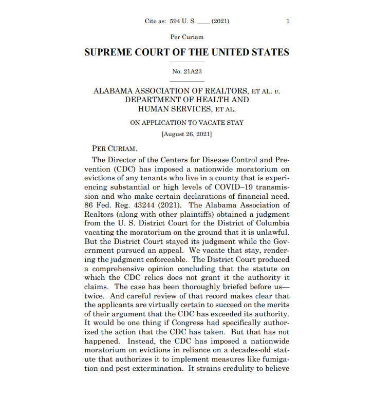 据外媒CNET报道,美国最高法院周四解除了拜登政府与COVID-19有关的租客驱逐禁令。这项裁决是在一个由房东和房地产贸易团体组成的联盟对该政策提出的挑战中作出的。