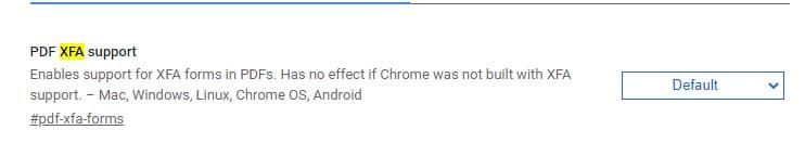 3. 搜索"XFA",在“PDF XFA support”的下拉菜单中,选择“已启用”并重新启动 Chrome 浏览器。