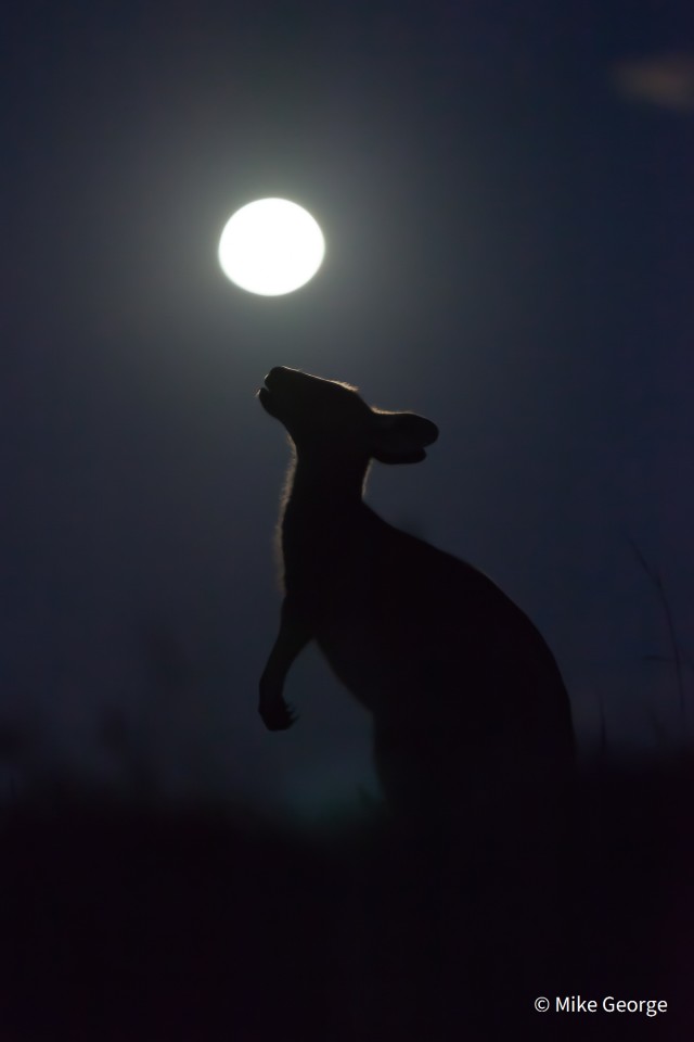 其中一个值得注意的亮点是Mike George拍摄的袋鼠对着月亮嚎叫的惊人镜头。George在夜晚小心翼翼地偷偷接近一只东部灰袋鼠并抓拍到了这张照片。