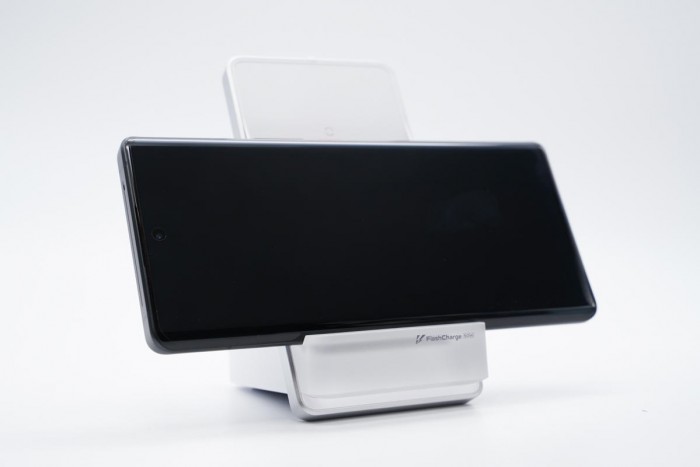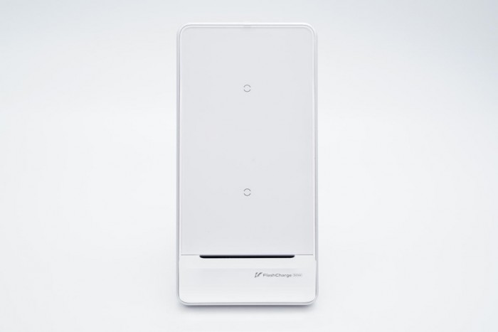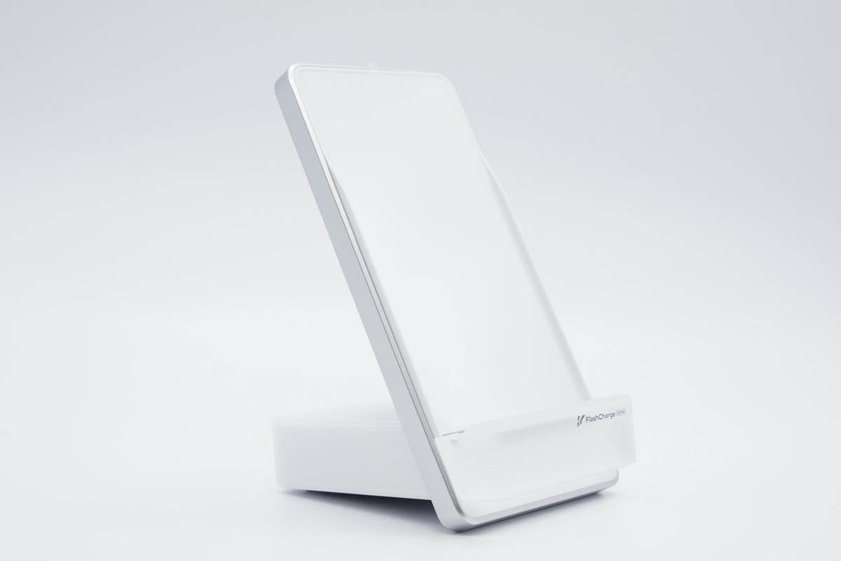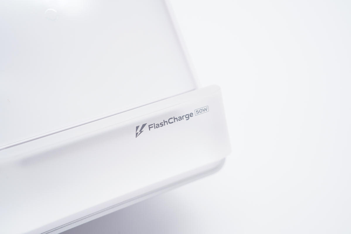 手机支撑平台为半透明亚克力块,一角印有FlashCharge和50W字样。