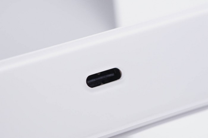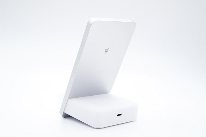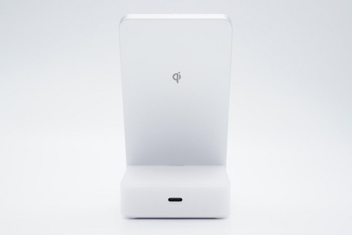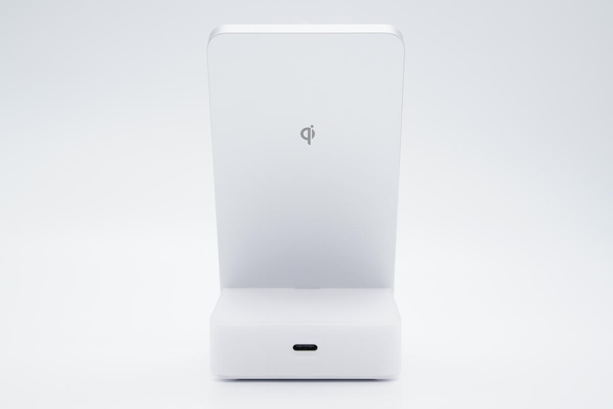 支撑板背面印有qi认证标识,底座上设有USB-C输入接口。