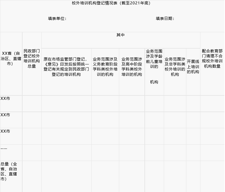 注:本表所称校外培训机构,是指中共中央办公厅、国务院办公厅《关于进一步减轻义务教育阶段学生作业负担和校外培训负担的意见》涉及的面向学龄前儿童、义务教育阶段学生、高中阶段学生的学科类和非学科类校外培训机构,不涉及职业培训机构以及面向成人的培训机构。