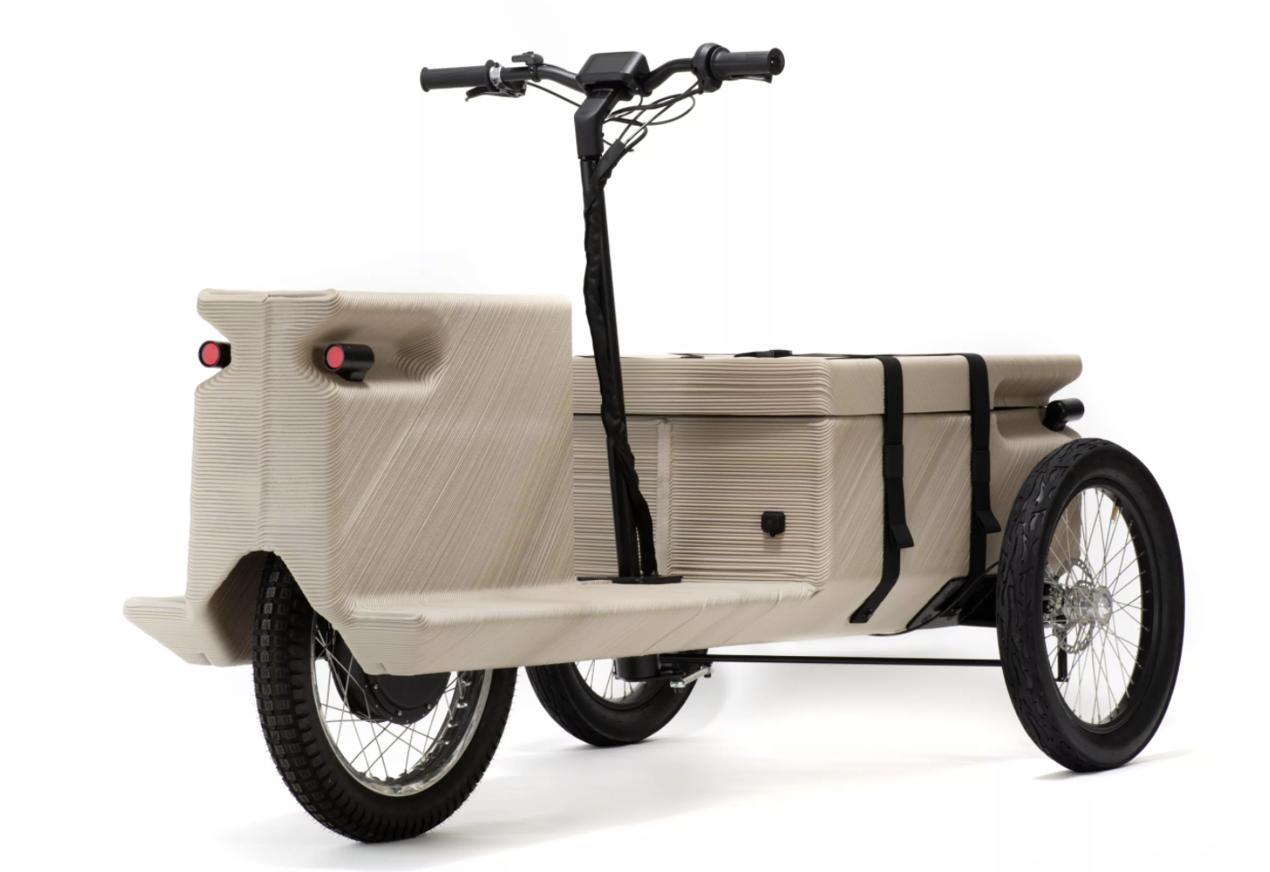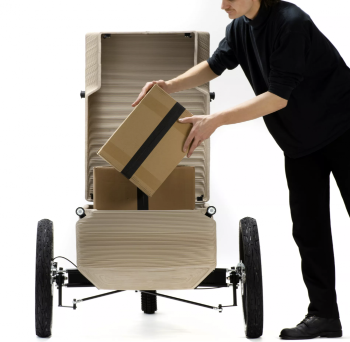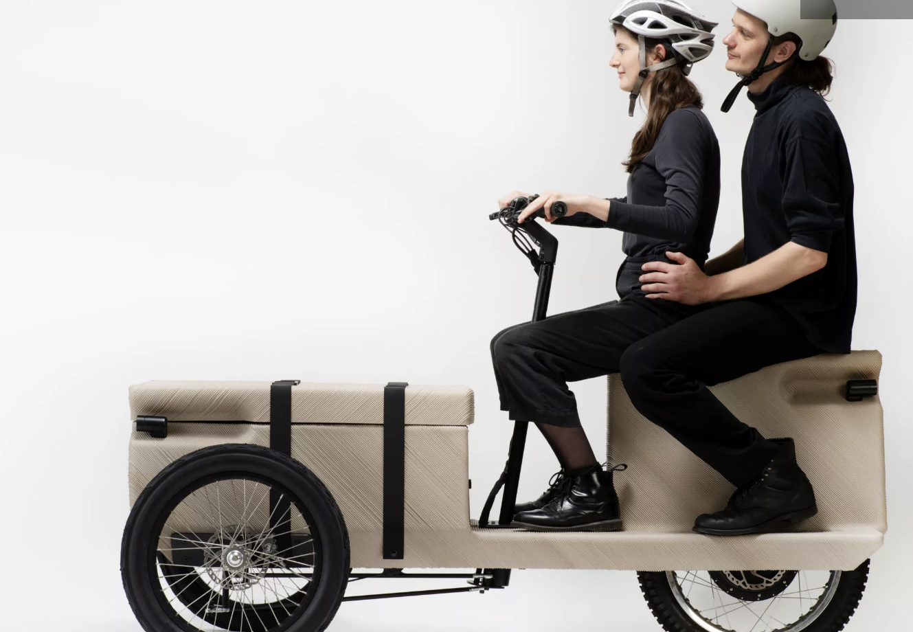 EOOS工作室与鹿特丹的The New Raw研究和设计工作室合作,使用工业3D打印机器人将70公斤(154磅)的回收塑料转化为货运自行车的车身、两人座位和储物箱,以一定的角度打印材料,因此在这个过程中几乎不需要支撑。