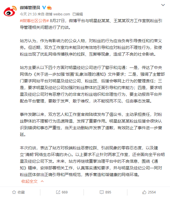 今天,微博还与明星赵丽颖、王一博双方工作室就粉丝引导管理相关问题,进行了约谈。