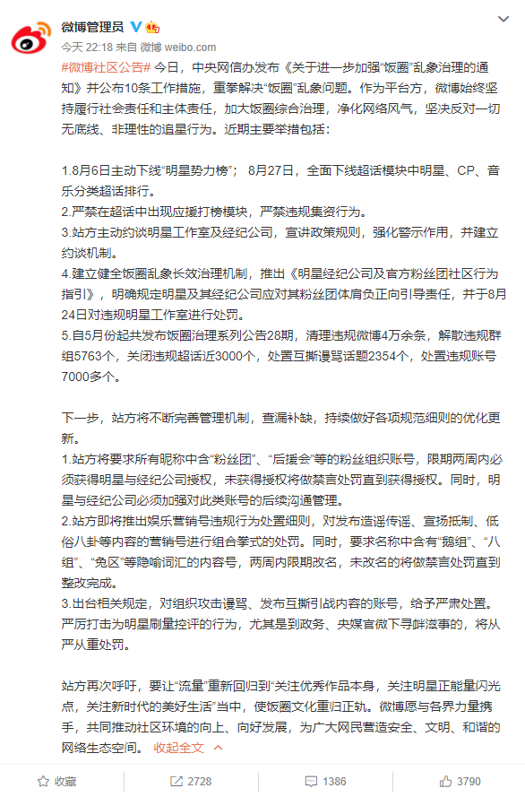 8月27日晚,新浪微博连发两则公告,宣布了“饭圈”乱象整治措施,并约谈了明星赵丽颖、王一博双方工作室。今日,中央网信办发布《关于进一步加强“饭圈”乱象治理的通知》,并公布10条工作措施,重拳解决“饭圈”乱象问题。