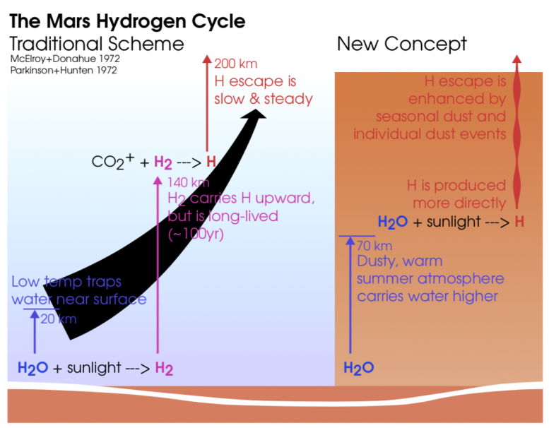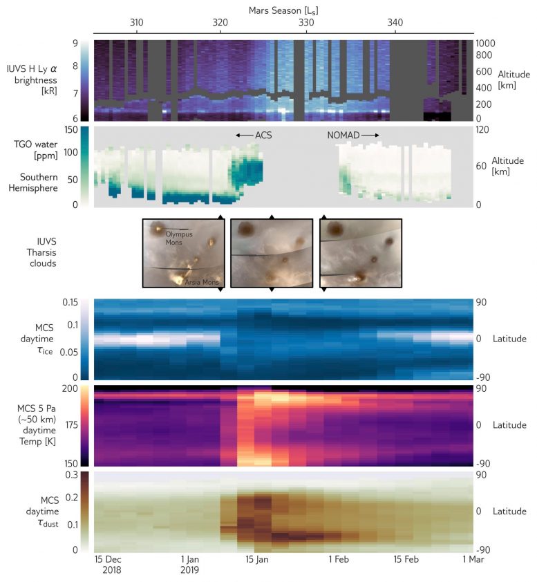 综合观测结果显示,在沙尘暴开始之前,低层大气中有水蒸气。随着沙尘暴的增加,加热大气层并产生风,仪器看到水蒸气被弹射到高空。微量气体轨道器在沙尘暴开始后发现中层大气中的水多了10倍,这与火星勘测轨道器上的红外辐射仪的数据正好吻合。MAVEN在离地表650英里处的观测结果也是如此,显示风暴期间氢气增加了50%。