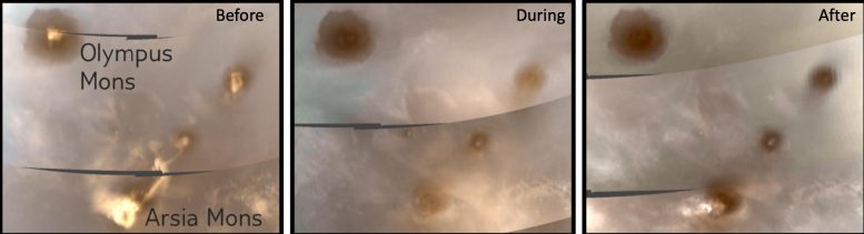 来自MAVEN的成像紫外光谱仪的图像证实,在2019年的沙尘暴之前,可以看到冰云在火星Tharsis地区高耸的火山上方盘旋。Chaffin解释说,由于冰在温暖的表面附近无法再凝结,这些云 “在沙尘暴全面展开时完全消失了”,然后在沙尘暴结束后重新出现。