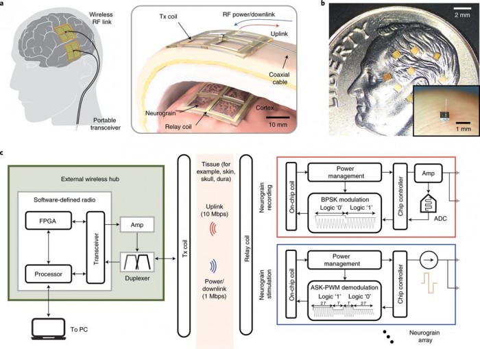 目前,大多数 BCI 系统只是使用 1 个或 2 个传感器对几百个神经元进行采样,但是神经科学家希望能够从更大的脑细胞群中收集数据。现在,一支科研小组向未来 BCI 系统的概念迈出了关键一步:该系统采用独立的、无线的微尺度神经传感器的协调网络,每个传感器大约有一粒盐大小,以记录和刺激大脑活动。被称为“neurograins”的传感器独立地记录神经元发射的电脉冲,并将信号以无线方式发送到一个中央枢纽,由其协调和处理这些信号。