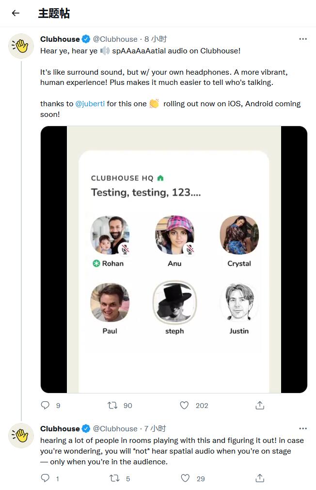 在接受外媒 TechCrunch 采访的时候,Clubhouse 的 Justin Uberti 表示,添加空间音频会使不同的扬声器听起来像是来自不同的物理位置,而不仅仅是一个位置。