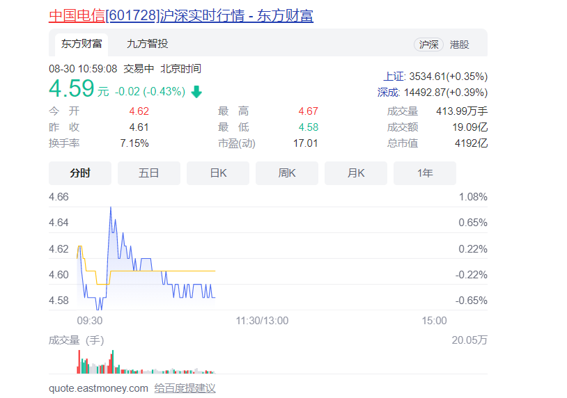 上周连续两次一字跌停,市值蒸发千亿后,中国电信A股进入走低振荡期,开启“阴跌”模式。8月30日(今天)周一开盘,中国电信报4.62元,随后4.58-4.67元之间振荡。截稿前,报4.59元,距离4.53元的发行价只差0.06元,市值4192亿,跌破4200亿大关。