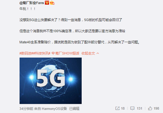此外,菊厂影业Fans还爆料称,华为的Mate40系列会全系降价,原因就是解决了配件部分替代,从而解决了一些问题。