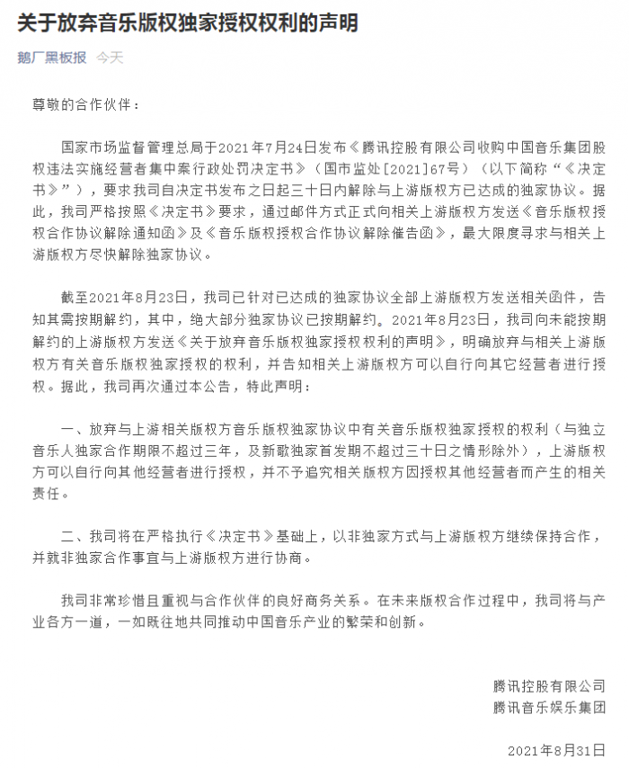 8 月 31 日晚间,腾讯发布了“关于放弃音乐版权独家授权权利的声明”。腾讯在声明中表示,截至 2021 年 8 月 23 日,腾讯已针对已达成的独家协议全部上游版权方发送相关函件,告知其需按期解约,其中,绝大部分独家协议已按期解约 。2021 年 8 月 23 日,腾讯向未能按期解约的上游版权方发送《关于放弃音乐版权独家授权权利的声明》,明确放弃与相关上游版权方有关音乐版权独家授权的权利,并告知相关上游版权方可以自行向其它经营者进行授权。