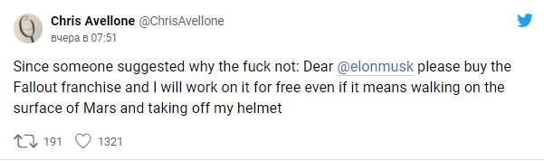 在推文中Avellone表示:“既然都有人提出了那为什么不呢:尊敬的埃隆马斯克请您买下游戏辐射的IP吧,我情愿因此为其免费打工,即便这像是在火星表面行走时脱下头盔那样困难我也愿意。”