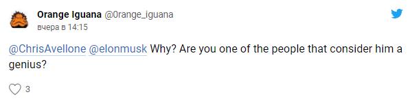 随后有不解的粉丝询问道:“为什么?你认为他是天才吗?” Avellone表示:“并不是,因为他玩了《辐射:新维加斯》,且比除了Matthew Perry之外的大多数富豪多,而且美国航天事业的失败让我丧失了实现自己去世前的太空旅行梦想的希望直到看到SpaceX计划的出现,我的太空梦似乎由有了实现的可能性。”
