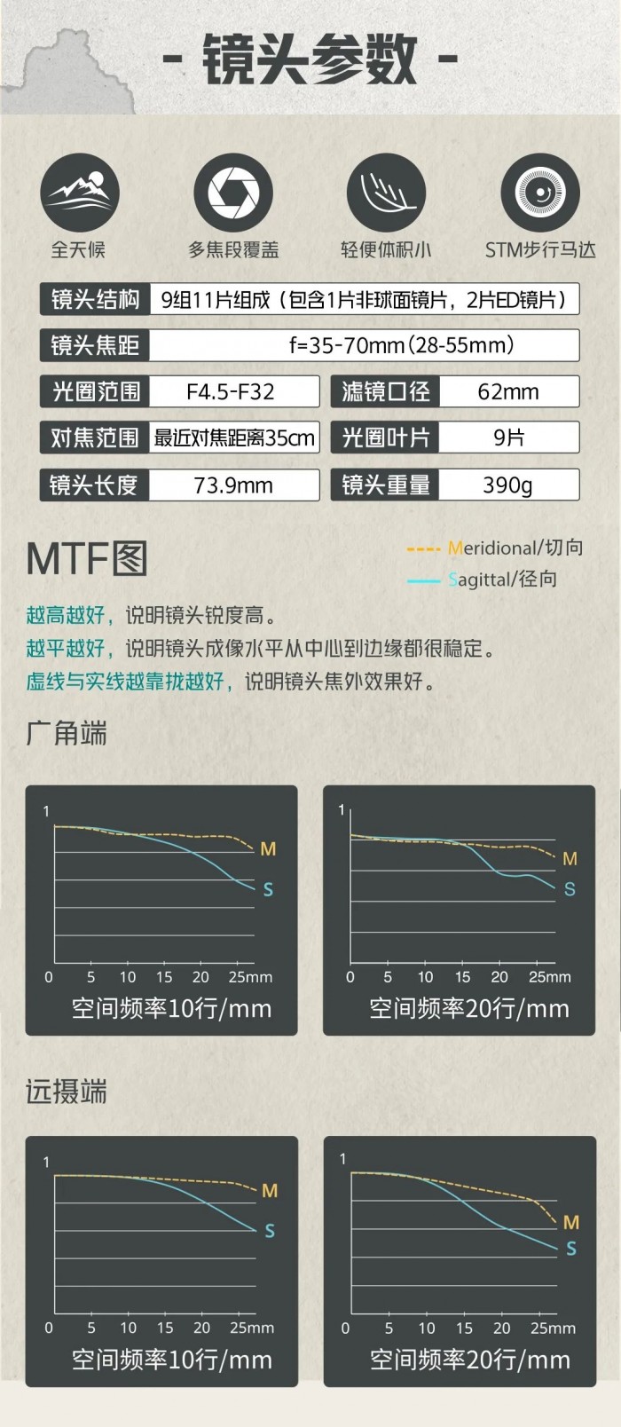 它囊括了多种焦距,覆盖从35mm广角到标准70mm,等效于35mm画幅28-55mm焦距,最近对焦距离35cm,能够对距离镜头最前侧元件约25cm的对象进行拍摄。