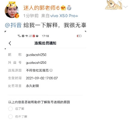 据悉,郭老师账号封禁后,她还曾发文质问平台“给我一下解释,我很无辜”!此时此刻的郭老师,依然没认识到问题的严重性,就在此消息发布不久后,郭老师的微博账号也被封禁,彻底没有了发声的途径。平台封禁郭老师给出的原因是违规,不符合社区规范。