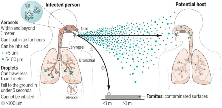 呼吸道气溶胶是由呼气活动形成的,如呼吸、说话、唱歌、喊叫、咳嗽和打喷嚏。在COVID-19之前,像烟一样漂浮的气溶胶和滴落的飞沫之间的传统尺寸分界线被设定为5 µm,然而,100 µm是一个更合适的尺寸区分。这个更新的尺寸更好地代表了能够在静止的空气中悬浮5秒以上(从1.5米的高度),从感染者身边走过一米以外,并被吸入的最大颗粒。“物理尺寸主要决定了它们能在空气中悬浮多长时间,能到达多远,是否能被吸入,以及如果被吸入,能进入呼吸道多深。”呼吸道活动产生的大部分气溶胶都小于5 µm,这使它们能够深入到支气管和肺泡区域并在那里沉积。研究发现,病毒在小于5 µm的气溶胶中的含量更高,"以色列Technion的肺部生理学家Josué Sznitman说。