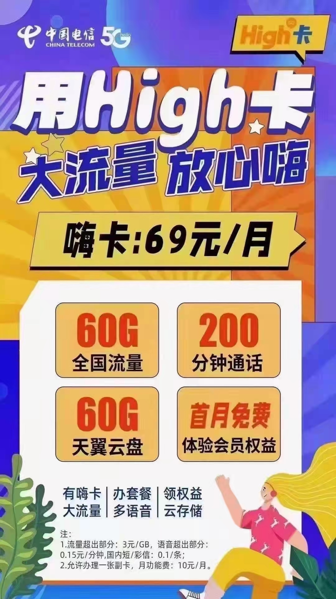月租69元 中国电信High卡归来:60G通用流量、200分钟通话