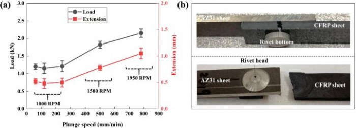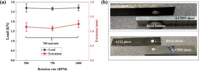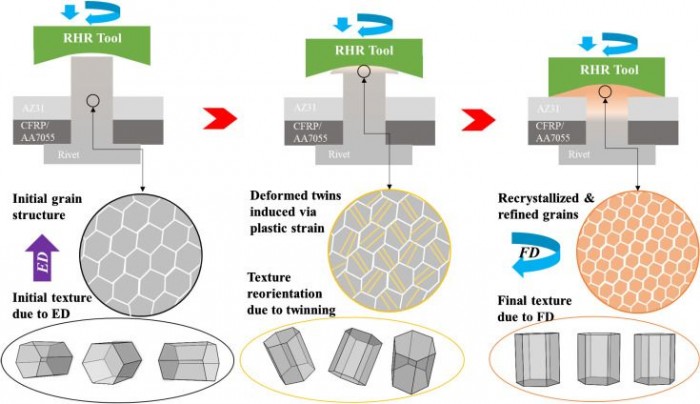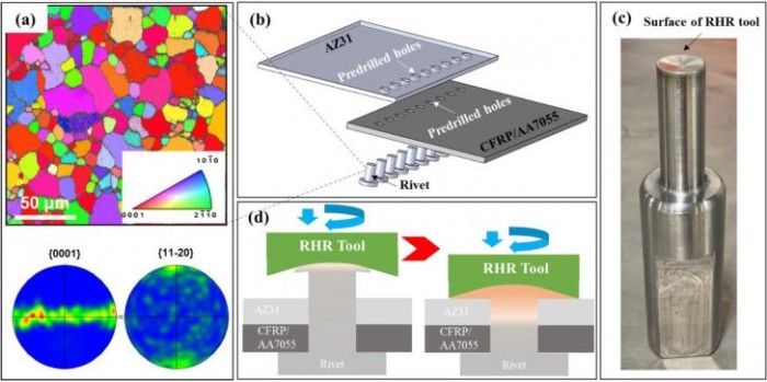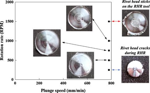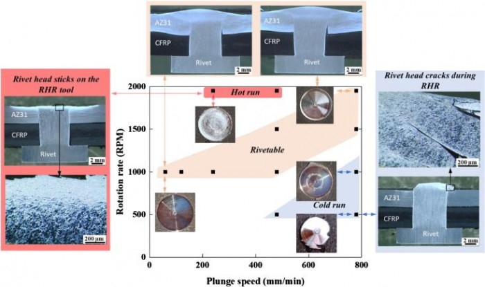 当锤子对着柄部旋转时,它产生摩擦,反过来产生热量。这种热量使镁变软,足以使锤子施加的压力能够迅速将其压扁。首席科学家王天浩(Tianhao Wang,音译)博士说:“我们花了很多时间来寻找锤子的旋转速度和我们将其插入铆钉的速度之间的正确平衡。但我们最终在加工范围内找到了一个甜蜜点,在RHR过程中,铆钉头不会粘附在工具上,也不会开裂”。