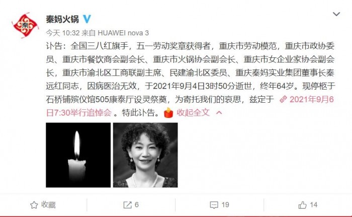 今天,秦妈火锅官方微博发布讣告。全国三八红旗手、五一劳动奖章获得者,重庆市劳动模范,重庆市政协委员、重庆市餐饮商会副会长、重庆市火锅协会副会长、重庆市女企业家协会副会长,重庆市渝北区工商联副主席、民建渝北区委员、重庆秦妈实业集团董事长秦远红同志,因病医治无效,于2021年9月4日3时50分逝世,终年64岁。