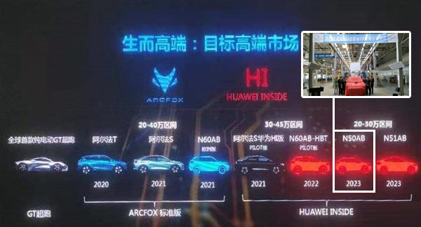 日前,有媒体报道,极狐品牌还将推出一款代号为N50AB的全新紧凑型纯电动SUV,可视作“小号”ARCFOX 阿尔法T,与大众ID.4系列同级别,目前试制首台白车身已经下线。根据此前曝光的计划图表,代号为N50AB的车型将与华为合作打造,主打20-30万元价格区间,正式上市会在2023年。