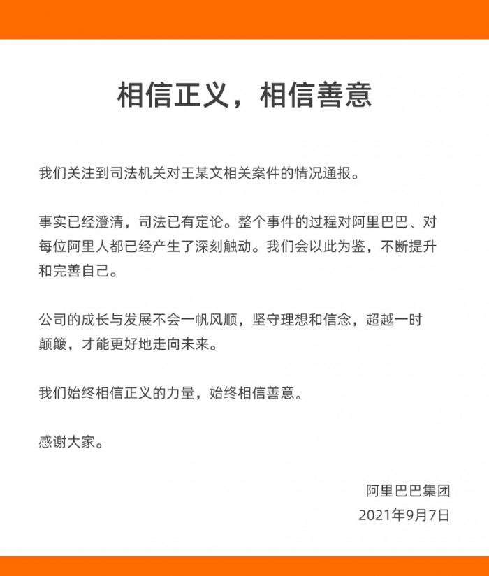 9月6日消息,今日,针对阿里女员工事件,阿里巴巴在其官方微博发布名为“相信正义,相信善意”的回应。阿里巴巴称,“我们关注到司法机关对王某文相关案件的情况通报。事实已经澄清,司法已有定论。整个事件的过程对阿里巴巴、对每位阿里人都已经产生了深刻触动。我们会以此为鉴,不断提升和完善自己。公司的成长与发展不会一帆风顺,坚守理想和信念,超越一时颠簸,才能更好地走向未来。我们始终相信正义的力量,始终相信善意。”