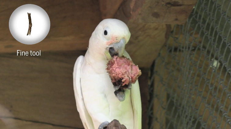 在鸟群中的15只鸟中,只有两只被看到制作这些工具包,但研究小组说,他们在野外发现了一些被丢弃的这些工具,包括一个仍然卡在海芒果中的工具。这表明凤头鹦鹉在个体之间传递知识,这是一种以前在海豚和灵长类等其他物种中看到的文化学习。