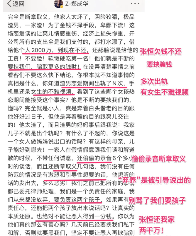 郑父年初对张恒的回应通篇都在谈“钱”,根本不屑谈及普罗大众在意的一切伦理道德,足见其多怕失去这颗“摇钱树”。