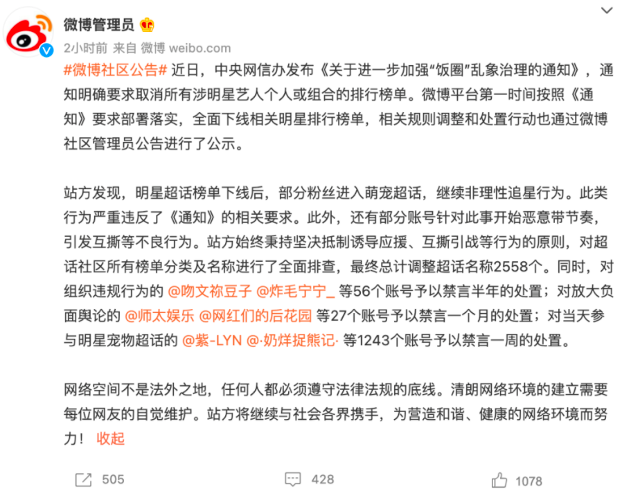 8月27日晚,微博公告全面下线超话模块中明星、CP、音乐分类超话排行,严禁在超话中出现打榜模块、严禁违规集资行为等的通知。这是微博继8月6日下线明星势力榜之后,又一次下线与明星相关的重要业务模块。