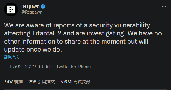 重生工作室在Twitter上回应说道:“我们已经知道了有关影响《泰坦陨落 2》 的安全漏洞的消息并正在着手调查。我们目前没有其它信息可以分享,但一定会在第一时间给大家带来新消息。”