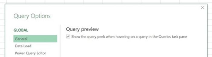要隐藏查询预览弹出按钮,请转到“数据”选项卡,然后选择“获取数据”>“查询选项”。在全局 > 常规中,取消选中在“查询”任务窗格中悬停在查询上时显示查询查看选项。