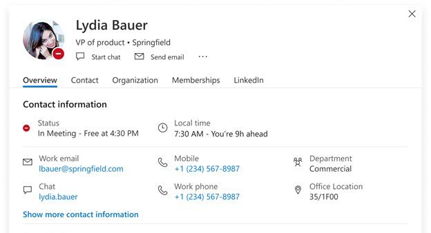 您是否在凌晨 3 点(他们所在的位置)向同事发送紧急电子邮件?现在,您只需在 Outlook 中查看同事的个人资料卡片,即可快速查看同事的时区和工作时间,并做出更明智的沟通决策。