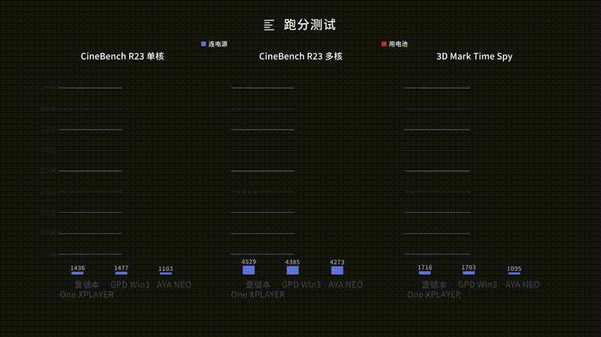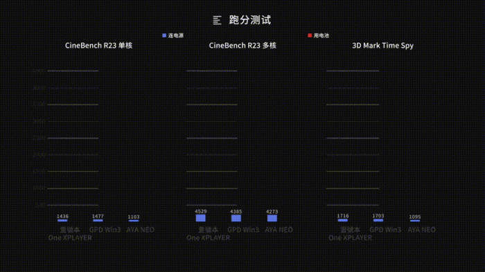 实际游戏前,我们先用跑分软件给三款机型进行了测试。在连接电源时,三者的CineBench多核得分比较接近,但在CineBench单核测试以及3D Mark测试中,AYA与其他两款有着不小的差距。