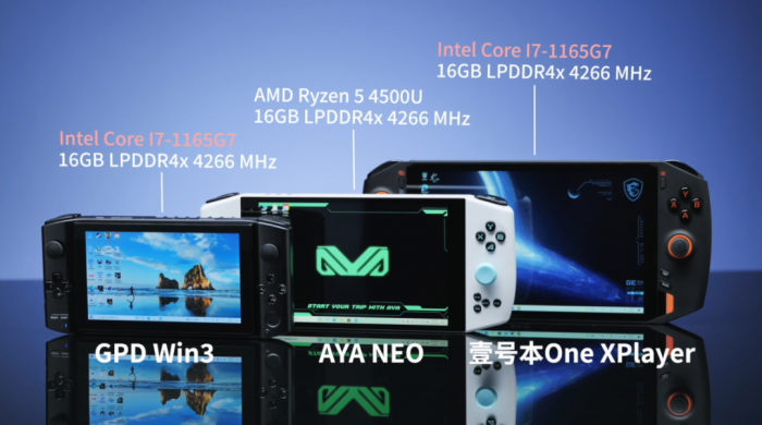 在处理器方面,壹号本和GPD选择了11代酷睿i7-1165G7,4核2.8GHz主频。AYA则用了AMD YES的锐龙5 4500U,6核2.3GHz主频。两者都是面向轻薄本的移动端处理器,整体水平相差不多。