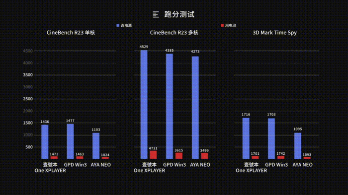 在使用电池时,壹号本的CineBench表现不仅与其他两款机型拉开了差距,甚至还超过了自己连电源时的表现。