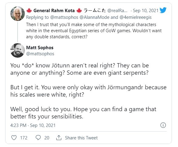 Matt Sophos则回复道:“北欧神话中也有蓝矮人吗?洛基是希腊半神的儿子吗?你知道约顿海姆不是真的吗?他们可以是任何人或任何东西,有些甚至是巨蛇?但我明白了。你觉得耶梦加得没问题只是因为他的鳞片是白色的,对吧?嗯,祝你好运。希望你能找到一款更适合你的感受的游戏。”