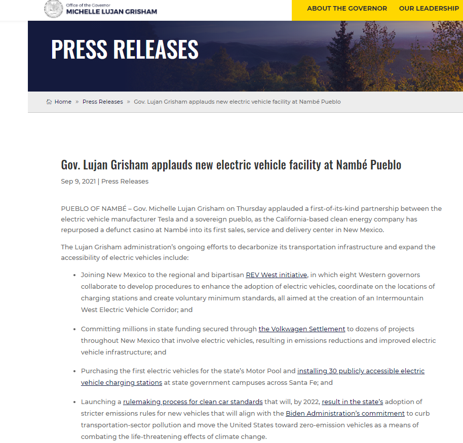 新墨西哥州州长米歇尔·卢扬·格里沙姆 (Michelle Lujan Grisham)表示,这是特斯拉在该州的首个销售、服务和配送中心。