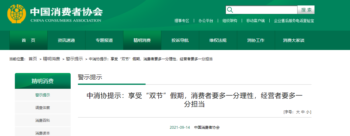 最后,中消协祝愿广大消费者度过一个平安顺遂的“双节”假期!