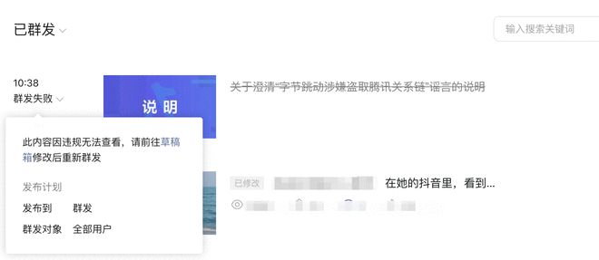 据网传截图,9月14日上午,微信公众号平台屏蔽了上述抖音这一澄清声明,其给出的理由是“此内容因违规无法查看”。
