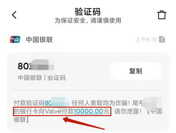 徐女士扫描二维码后,按照网页要求填写了自己的银行卡号和个人信息,随后收到了一条短信验证码。可能徐女士没有仔细看,但是验证码中明确显示,这张银行卡即将向V社付款 1 万元!在将验证码输进网页后,徐女士收到扣款通知才反应过来上当了,随后立即报警。