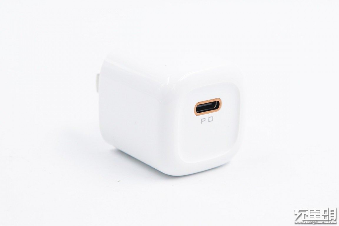 充电器以白色为主,可以看到并非规则形体,而是可以看到侧面的微微弧度,边缘处经过处理,整体手感不错,单USB-C口配置,输出面板印有“PD”、“20W Max”,具备5V3A、9V2.22A、12V1.67A三组固定电压档位。固定插脚设计,三围尺寸33.79mm * 30.17mm * 30.19mm,功率密度0.65W/cm³ 。