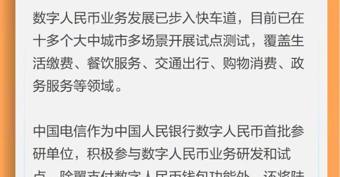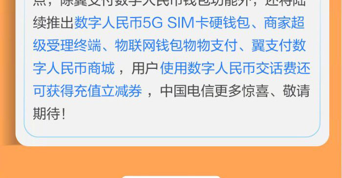 不仅如此,为方便用户日常生活需要,中国电信数字人民币还将提供话费充值功能。
