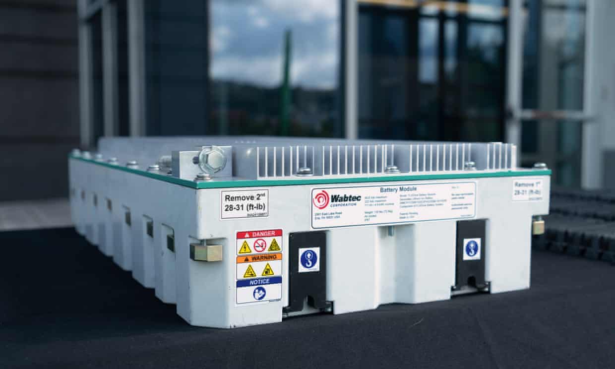 在莫农加希拉河畔的卡内基梅隆大学科技园的一条铁路上,这列樱桃红色、长75英尺的火车向政治家、铁路高管和学者们开放,他们敦促行业更快地从化石燃料中转型。贵宾们被允许爬上一个垂直的梯子,检查列车的内部,其中包括一个小型驾驶室,前面是500个锂离子电池模块,这些电池模块成堆排列在车辆的中心。