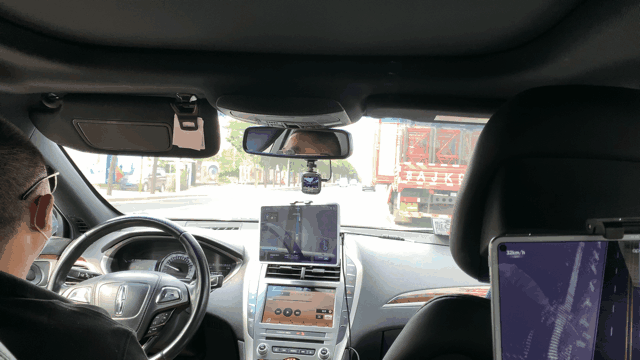 大部分车辆的车内共有 5 块显示屏,分别是车辆自带的中控显示屏,上面显示地图信息;自动驾驶显示屏,上面显示目前车辆的行驶信息,其中包括路面可视化、车速、地图等信息;订单显示屏,上面显示着订单信息、故障原因以及问题记录等信息;后排两块自动驾驶显示屏,上面显示车辆的行驶信息以及红绿灯情况。